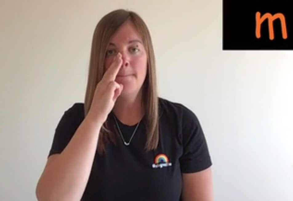 Draw the symbol in the air with your hand, fingers together, moving outward from your mouth.